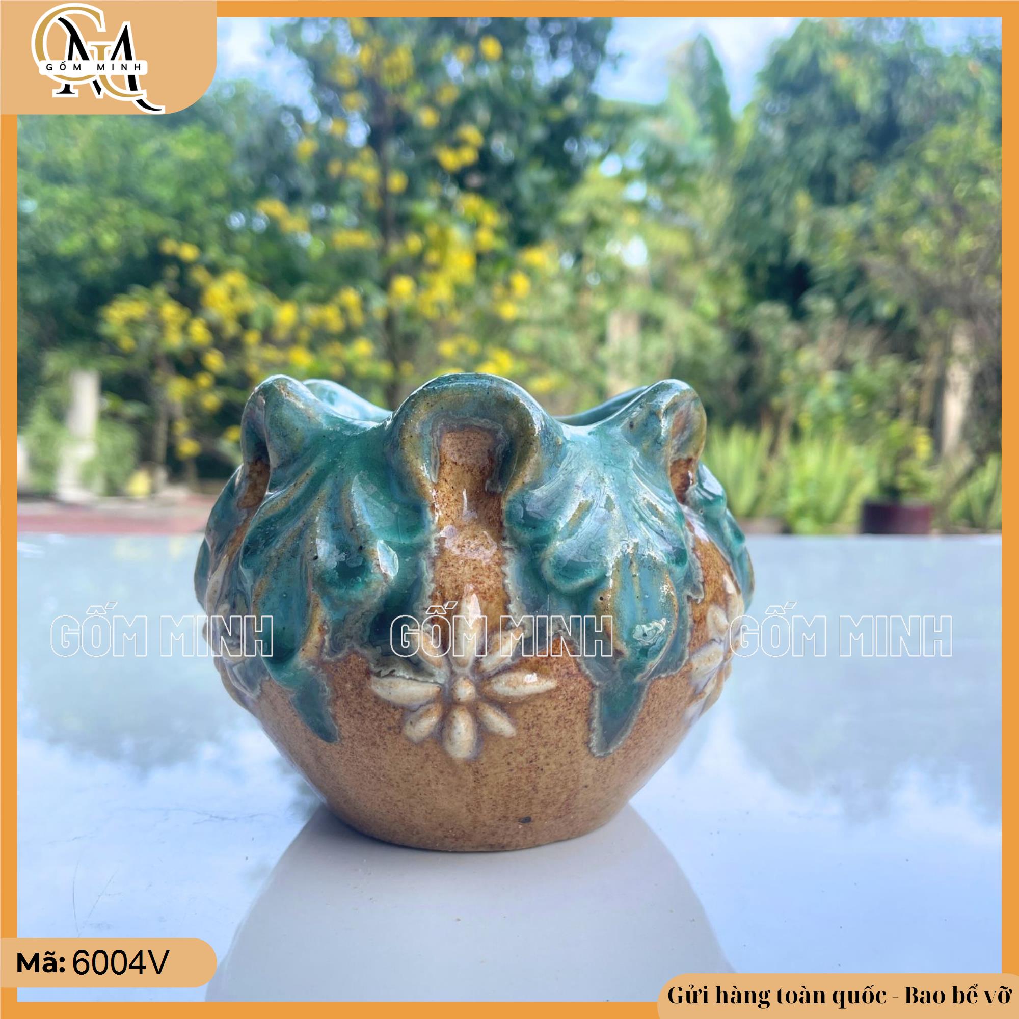 Chậu có miệng hình tròn, kích thước phủ bì 13cm, với thành chậu dày, chắc chắn, tạo cảm giác cứng cáp, bền bỉ. Điểm nhấn đặc biệt là các bông hoa 8 cánh được đính đều trên nhiều mặt chậu, mang đến sự hài hòa, sinh động cho thiết kế tổng thể. Lớp men phủ ngoài theo kiểu giả cổ, mang đậm nét đẹp truyền thống, cổ điển nhưng không kém phần sang trọng.