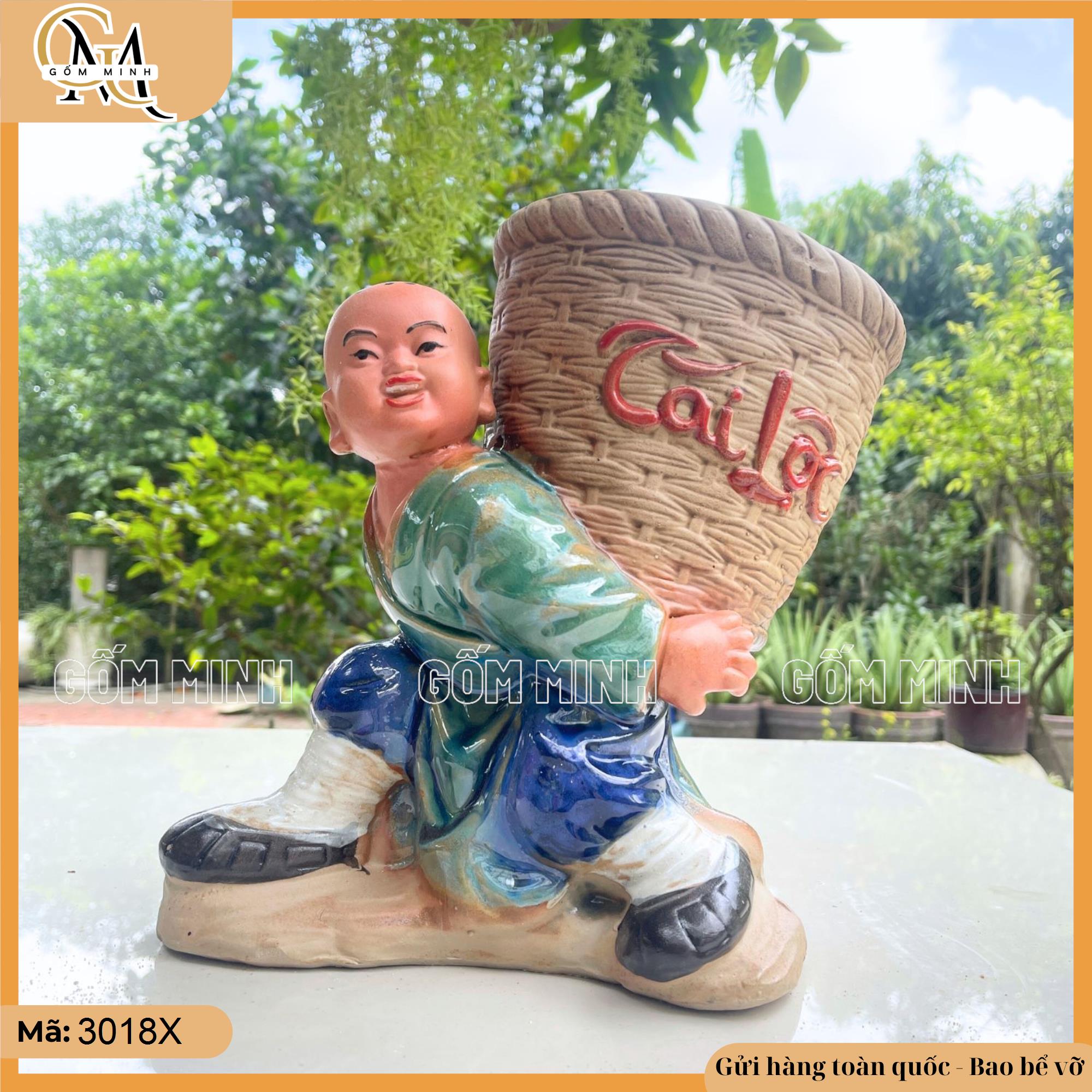 Thiết kế: Chậu tượng chú tiểu được khắc họa trong tư thế cõng một chiếc giỏ sau lưng, với gương mặt hiền hậu và nụ cười tươi tắn. Chiếc giỏ được trang trí nổi bật với chữ Tài Lộc, tượng trưng cho sự thịnh vượng và may mắn. Thiết kế của chậu gốm kết hợp giữa sự đơn giản của chú tiểu và sự tinh tế của chiếc giỏ, tạo nên sự hài hòa trong từng chi tiết. Màu sắc tươi sáng và bố cục cân đối làm tăng thêm vẻ trang nhã cho chậu gốm Bát Tràng.
