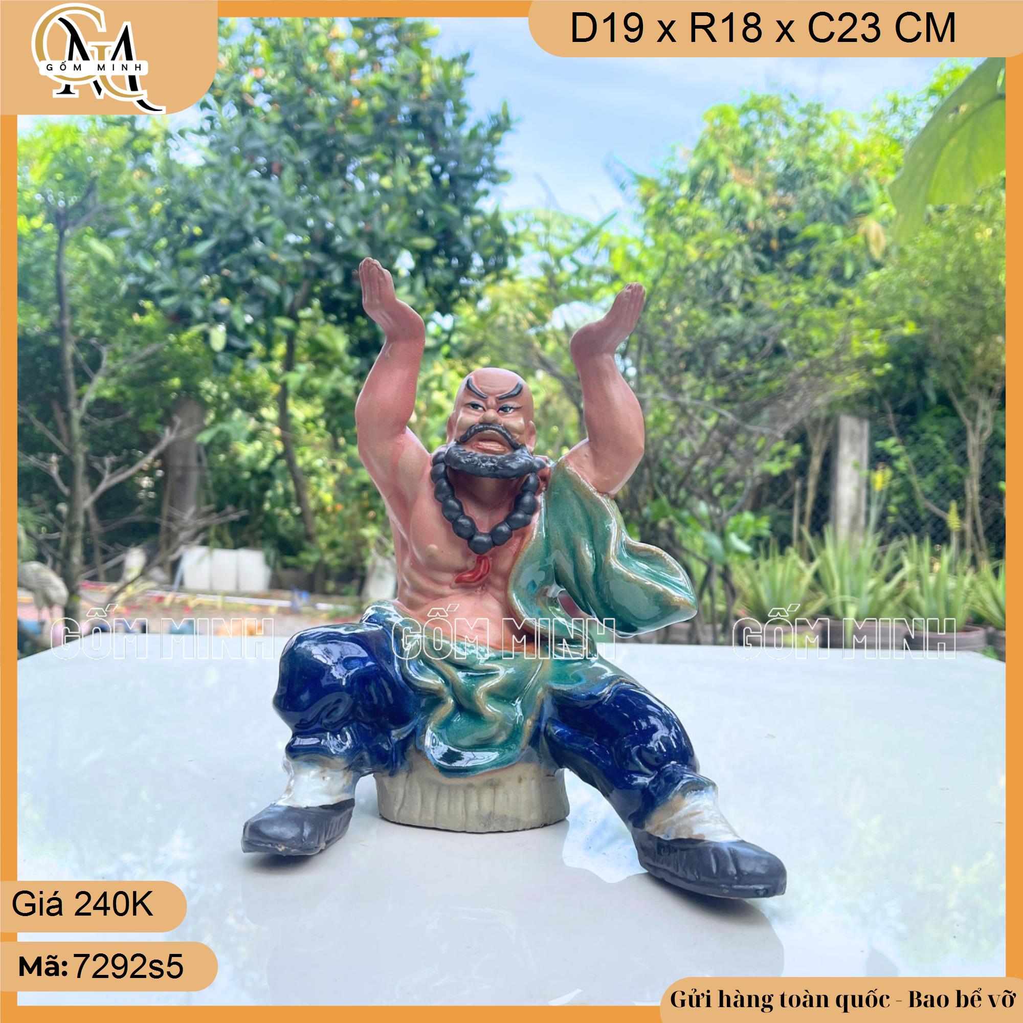 Chậu tượng Lỗ Trí Thâmlà một kiệt tác từ gốm Bát Tràng, tái hiện hình ảnh Lỗ Trí Thâm đầy uy nghi, dũng mãnh. Tượng được thiết kế tinh xảo với dáng đứng vững chãi, hai tay dâng cao chiếc vò lớn. Trên bề mặt vò, dòng chữ "Tài Lộc" được khắc tỉ mỉ, nổi bật, mang đến cảm giác trang trọng và ý nghĩa.