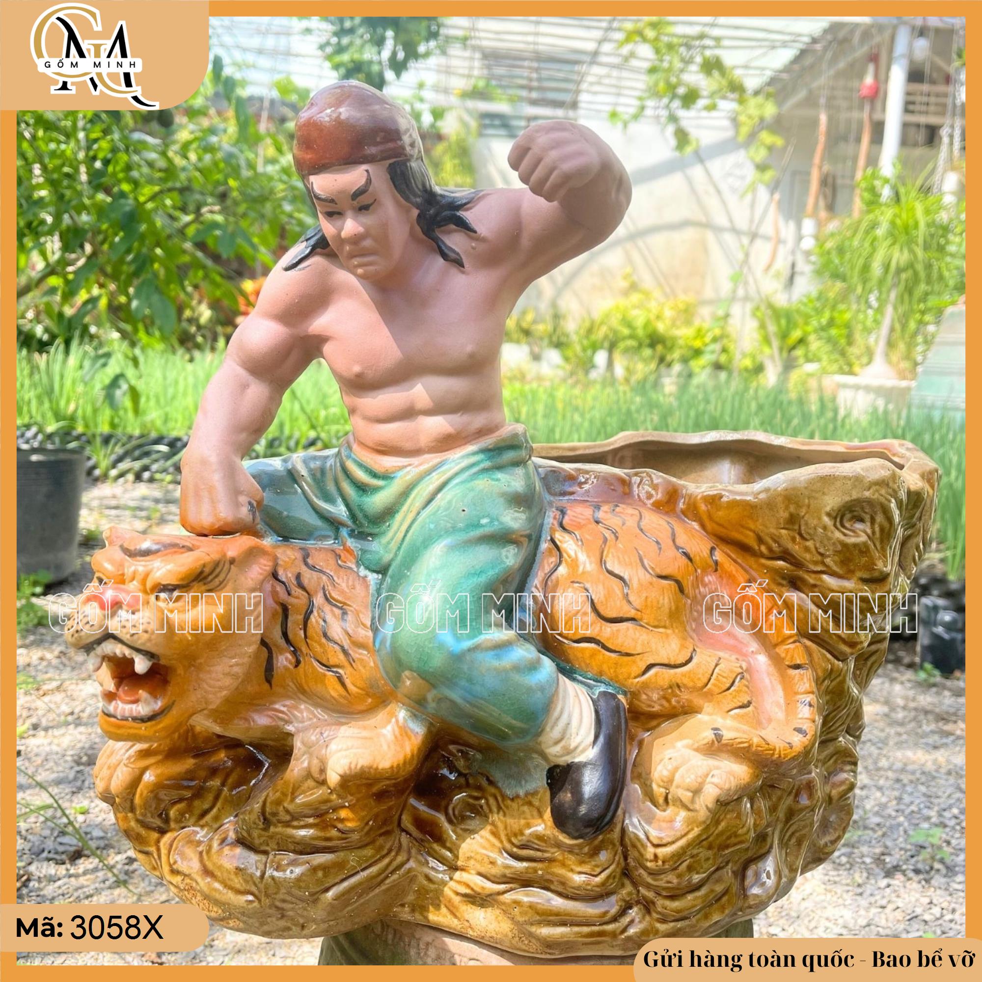 Thiết kế: Chậu tượng được chế tác tinh xảo, mô phỏng cảnh tượng anh hùng Võ Tòng đánh hổ, một hình ảnh nổi tiếng trong văn hóa dân gian Trung Quốc. Võ Tòng được khắc họa với tư thế mạnh mẽ, dũng cảm, đang quyết liệt chiến đấu với con hổ. Gương mặt của Võ Tòng toát lên vẻ kiên cường, quyết tâm, trong khi con hổ dữ tợn, mạnh mẽ, thể hiện sự đối đầu ác liệt. Từng chi tiết từ cơ bắp, trang phục của Võ Tòng đến lông vằn của con hổ đều được chăm chút kỹ lưỡng, mang đến một tác phẩm sống động và mạnh mẽ.
