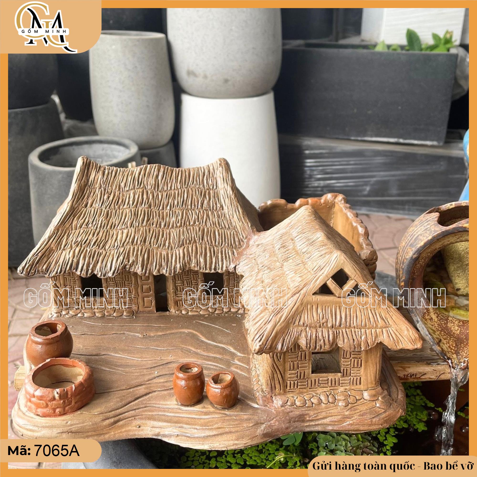 Tiểu cảnh này tái hiện hình ảnh ngôi nhà tranh hai gian đặc trưng của làng quê Việt Nam. Ngôi nhà được chế tác từ gốm Bát Tràng với phần mái tranh dốc, tường nhà đơn sơ, mộc mạc. Trước sân nhà, có giếng nước cổ truyền với gạch đỏ bao quanh, cạnh đó là vài chiếc chum, vại đựng nước hoặc đồ dùng. Những chi tiết nhỏ đều được tạo hình tỉ mỉ, mang đến cảm giác gần gũi và chân thật. Kích thước lớn của tiểu cảnh giúp dễ dàng nổi bật và thu hút sự chú ý trong không gian trưng bày.