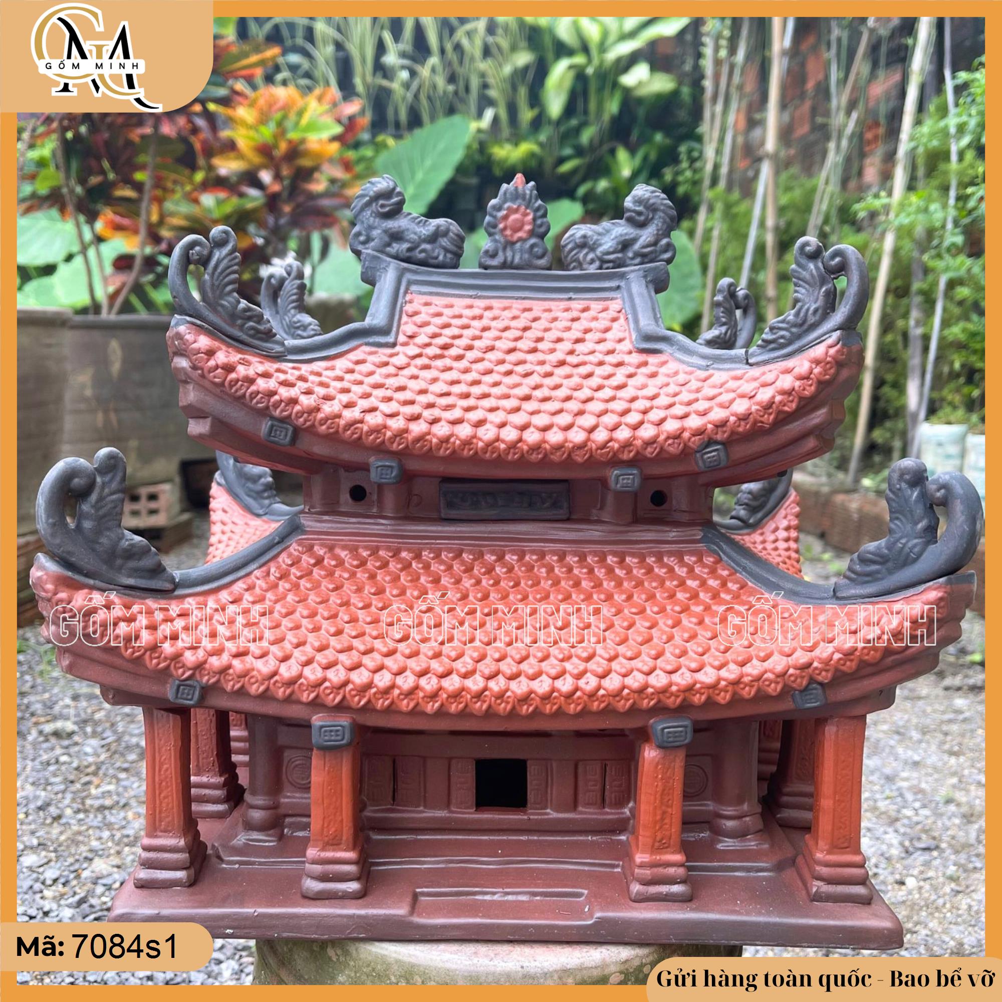 Mô hình chùa hai mái lớn được chế tác tinh xảo từ gốm đất đỏ, mang nét đẹp truyền thống của kiến trúc cổ Việt Nam. Chùa có kích thước tỷ lệ hài hòa, tạo cảm giác bề thế mà vẫn trang nhã. Hai mái cong vút mềm mại, được tạo hình uốn lượn tinh tế, thể hiện sự bay bổng và độc đáo trong phong cách thiết kế. Các chi tiết nhỏ như cột trụ, gờ mái, và hoa văn trên bề mặt gốm đều được chăm chút tỉ mỉ, làm nổi bật giá trị thẩm mỹ và nghệ thuật.