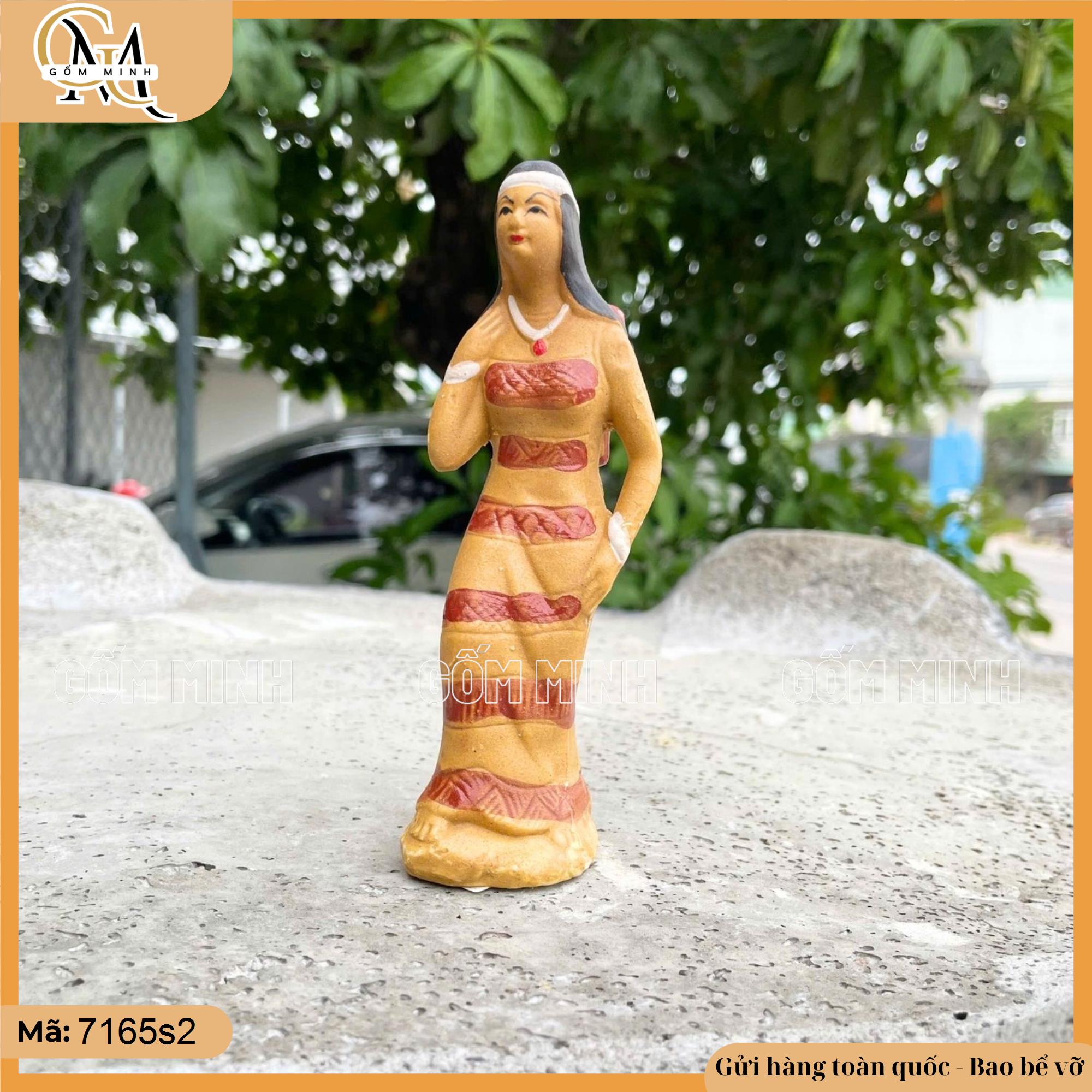 Tiểu cảnh cô gái dân tộc mang gùi được làm từ gốm với sự tỉ mỉ trong từng chi tiết. Cô gái mặc trang phục truyền thống, váy dài kết hợp với khăn quấn đầu đặc trưng. Chiếc gùi sau lưng thể hiện nét văn hóa lao động của người dân tộc thiểu số, tạo nên hình ảnh vừa mộc mạc vừa gần gũi. Màu sắc của váy áo và khăn quấn đầu được giữ đúng với sắc thái truyền thống, mang đậm hơi thở văn hóa vùng cao.
