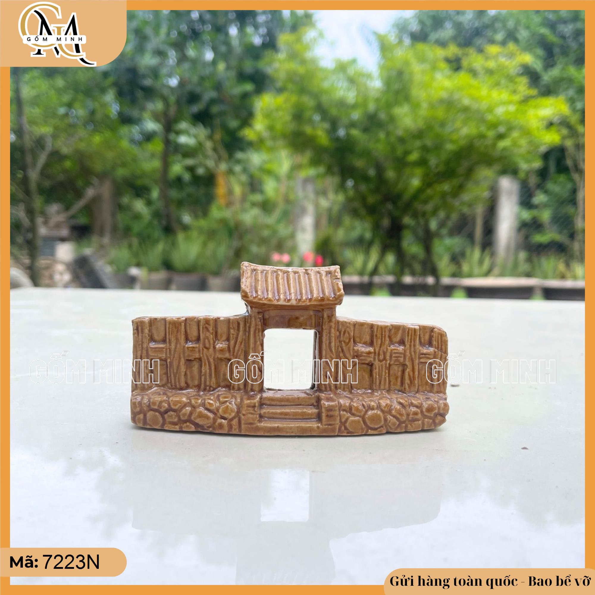 🔸 Thiết kế: Mô hình cổng rào nhỏ được làm từ gốm Bát Tràng, tái hiện hình ảnh cổng làng mộc mạc quen thuộc với hàng rào tre, mái ngói rêu phong và từng chi tiết thủ công đầy tinh tế. Kiểu dáng nhỏ nhắn, dễ kết hợp với các mô hình tiểu cảnh khác tạo nên khung cảnh làng quê thanh bình, gần gũi.
