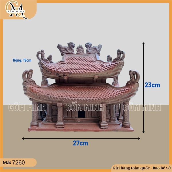 Mô hình chùa hai mái lớn được chế tác tinh xảo từ gốm đất đỏ, mang nét đẹp truyền thống của kiến trúc cổ Việt Nam. Chùa có kích thước tỷ lệ hài hòa, tạo cảm giác bề thế mà vẫn trang nhã. Hai mái cong vút mềm mại, được tạo hình uốn lượn tinh tế, thể hiện sự bay bổng và độc đáo trong phong cách thiết kế. Các chi tiết nhỏ như cột trụ, gờ mái, và hoa văn trên bề mặt gốm đều được chăm chút tỉ mỉ, làm nổi bật giá trị thẩm mỹ và nghệ thuật.