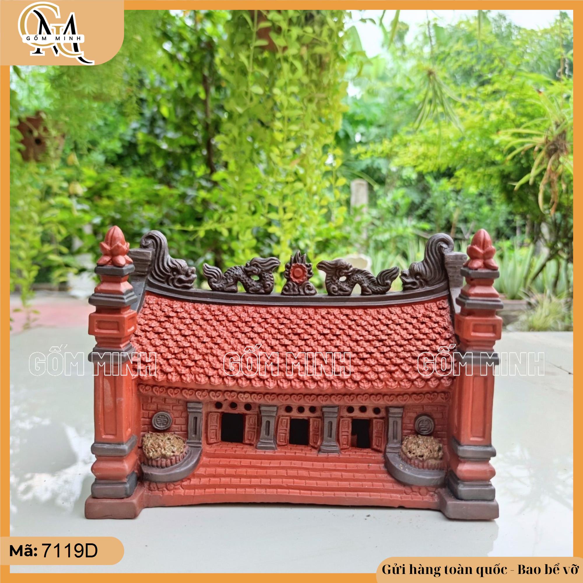 Mô hình đình làng được chế tác từ gốm đất đỏ, với kích thước lớn và các chi tiết được khắc họa rõ nét, tỉ mỉ. Từng đường nét mái đình cong vút, hoa văn trang trí trên các cột trụ, và nền đình đều thể hiện sự công phu trong thiết kế. Chất liệu đất đỏ mang lại vẻ đẹp truyền thống, đậm chất văn hóa làng quê Việt Nam.
