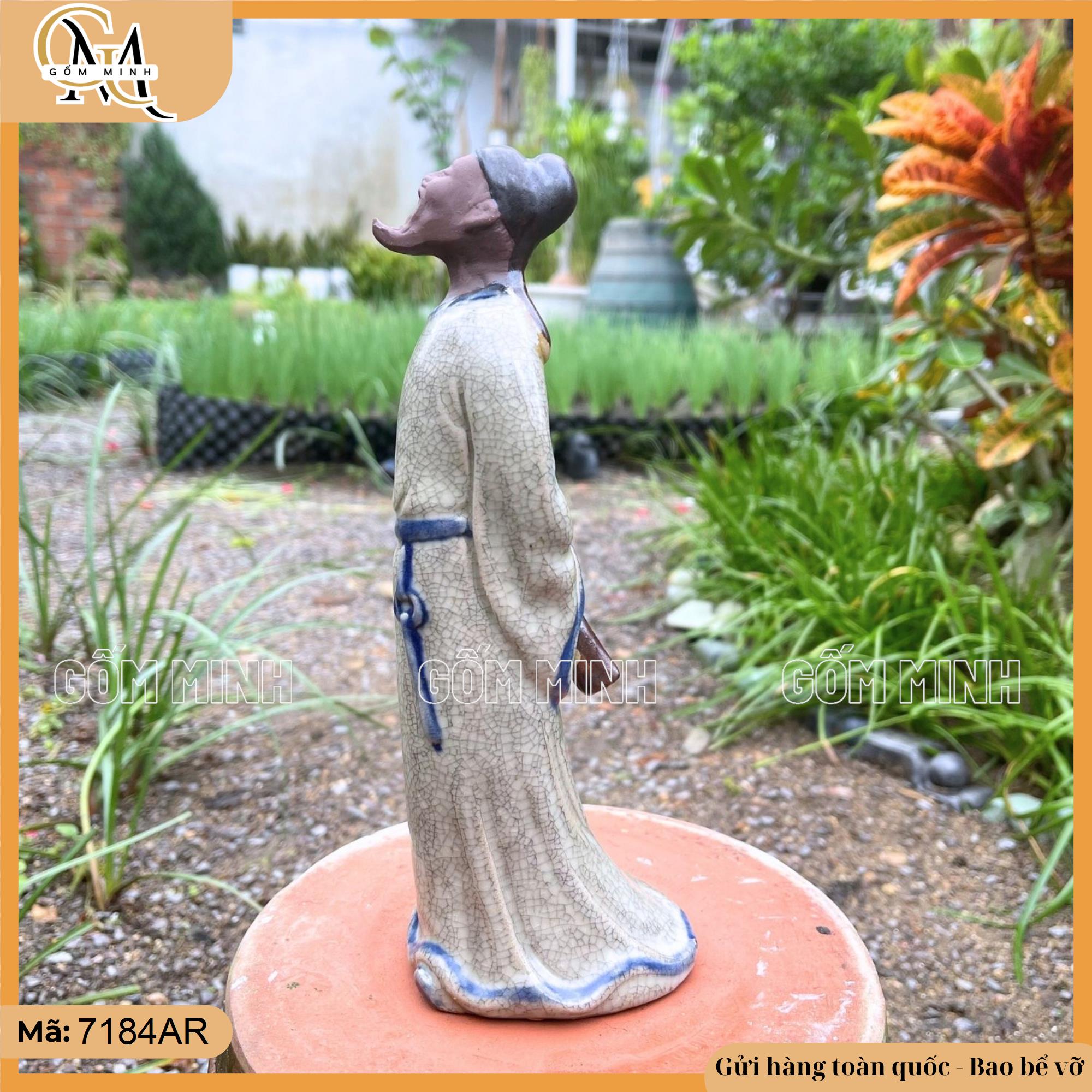 Được làm từ chất liệu gốm cao cấp với lớp men mịn, tạo nên vẻ ngoài cổ kính, trang nhã. Bề mặt tượng được gia công tỉ mỉ, tạo cảm giác chân thực và cuốn hút, mỗi chi tiết từ trang phục đến biểu cảm khuôn mặt đều thể hiện rõ tài hoa của người nghệ nhân.