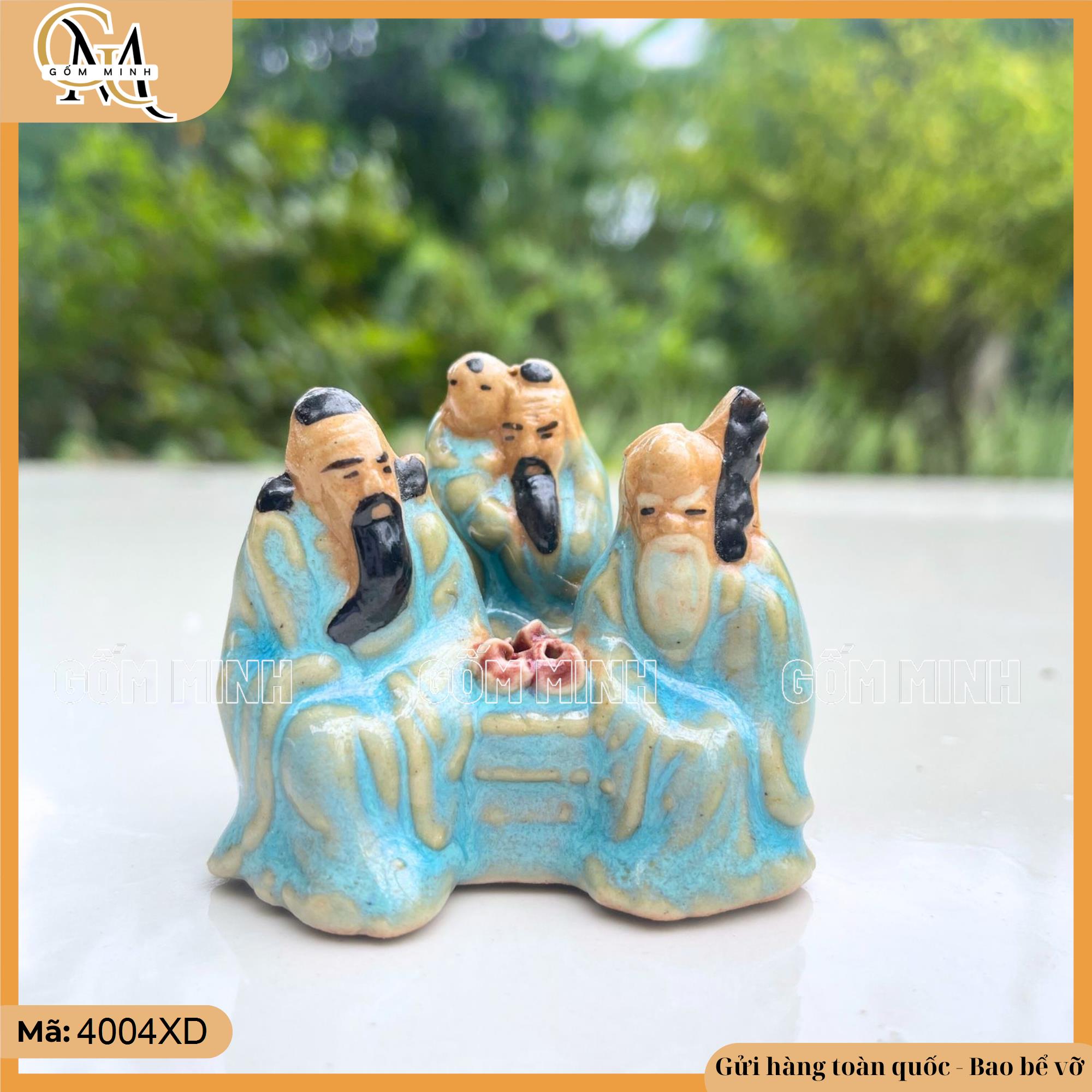 Tiểu cảnh mini Tam Đa bàn đào từ gốm Bát Tràng tái hiện hình ảnh ba ông lão Phúc, Lộc, Thọ – biểu tượng của sự may mắn, tài lộc, và trường thọ. Trong tiểu cảnh, ba ông lão ngồi quây quần bên một chiếc bàn tròn, trên bàn có một đĩa đào tiên, tượng trưng cho sự trường thọ và hạnh phúc. Cả ba ông đều được chế tác với những đường nét tinh xảo, mỗi người mang một dáng vẻ riêng.