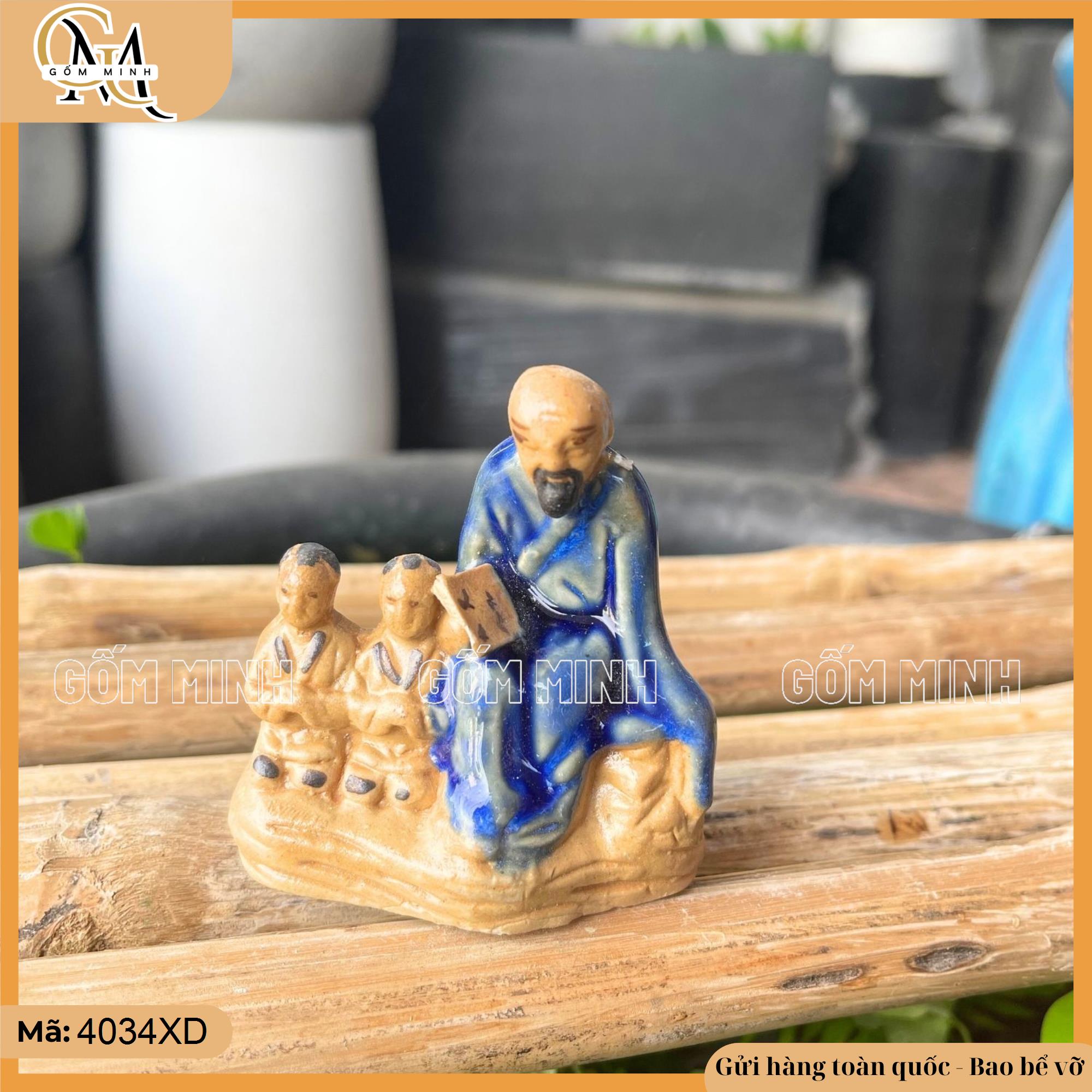 Tiểu cảnh thầy và trò mini được chế tác tỉ mỉ từ gốm Bát Tràng, với hình ảnh người thầy dáng ngồi đĩnh đạc, tay cầm quyển sách, ánh mắt chăm chú giảng dạy. Ngồi bên cạnh là hai cậu học trò nhỏ, lắng nghe một cách nghiêm túc, đôi mắt sáng đầy hiếu học. Thiết kế chú trọng đến từng chi tiết nhỏ như dáng ngồi của thầy, tư thế của trò, và quyển sách mở nhẹ trên tay.