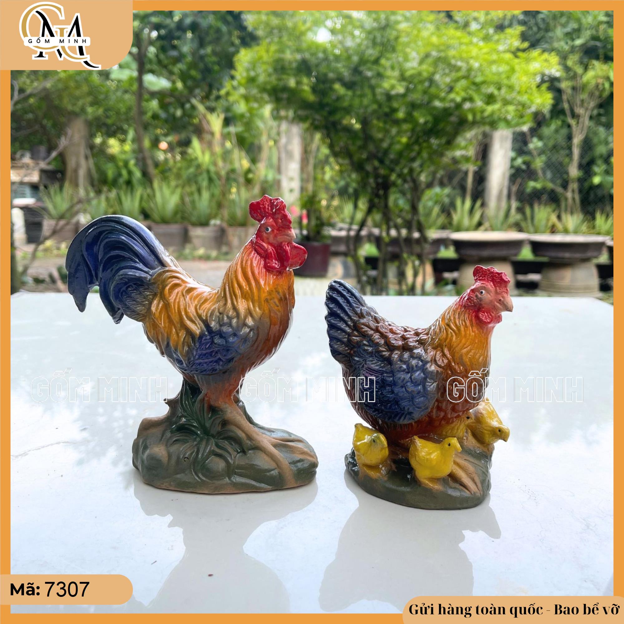 Tượng cặp gà gồm một gà trống và một gà mái cùng đàn con được chế tác tinh xảo từ gốm, mang phong cách trang trí truyền thống nhưng vẫn hiện đại. Gà trống oai phong với chiếc mào đỏ tươi và bộ lông được chạm khắc tỉ mỉ, từng chi tiết như lông đuôi hay chân đứng vững vàng đều toát lên vẻ mạnh mẽ. Gà mái dịu dàng, dáng vẻ hiền lành, lông mềm mại, đứng gần gà trống tạo thành một cặp hài hòa. Màu sắc được phối hài hòa, làm nổi bật vẻ đẹp tự nhiên của cặp gà.