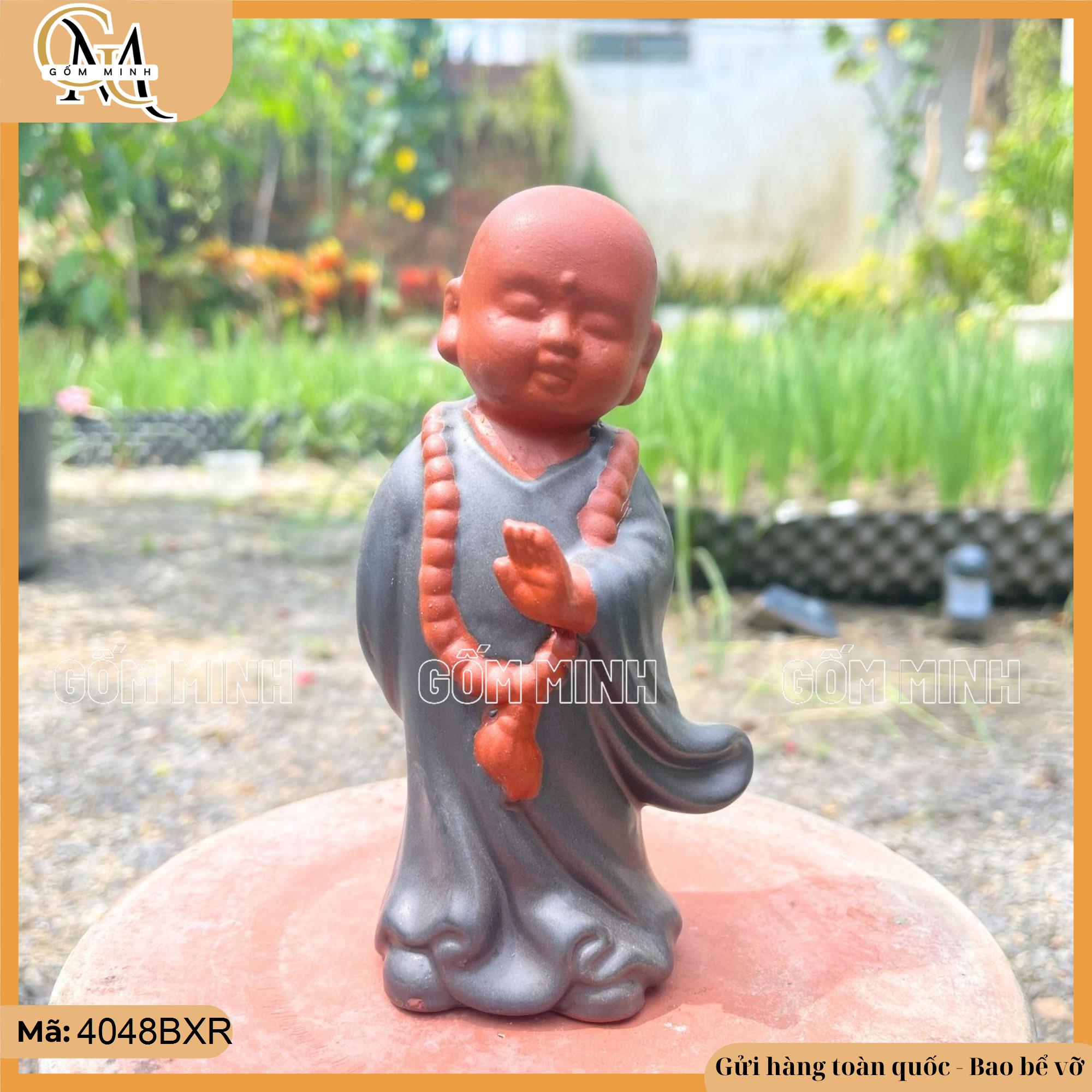 Tiểu cảnh tượng chú tiểu lớn được chế tác từ gốm Bát Tràng với nhiều mẫu khác nhau, mỗi mẫu đều thể hiện đặc điểm và tư thế riêng biệt của chú tiểu. Những chi tiết như khuôn mặt, trang phục và các phụ kiện như tràng hạt được làm tỉ mỉ, thể hiện sự tĩnh lặng và thanh thản.