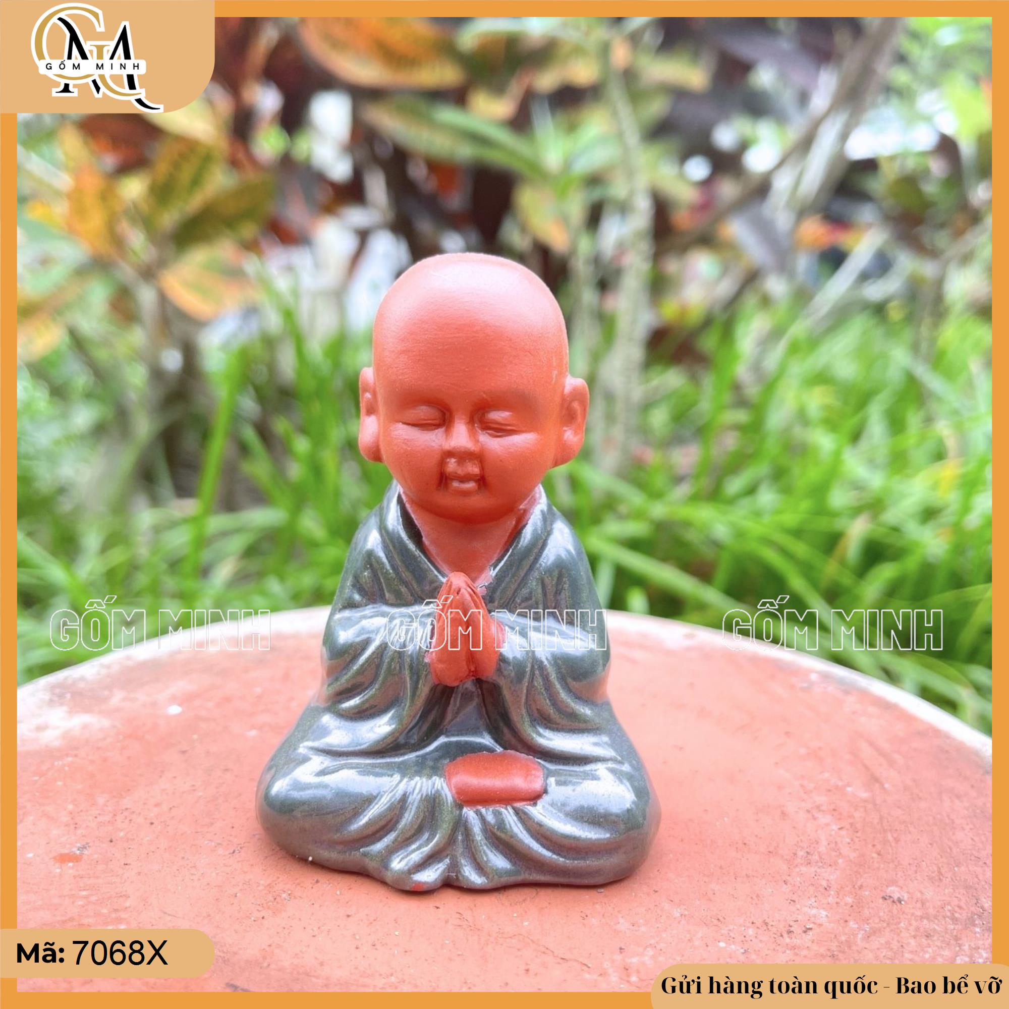 Tượng chú tiểu nhỏ ngồi chắp hai tay, mắt nhắm lại, được chế tác từ gốm Bát Tràng với độ tinh xảo cao. Tượng thể hiện hình ảnh chú tiểu trong tư thế thiền định, mang đến cảm giác bình an và tĩnh lặng. Khuôn mặt chú với nét hiền hòa, rạng rỡ, làm nổi bật vẻ đẹp trong sáng của tuổi thơ.