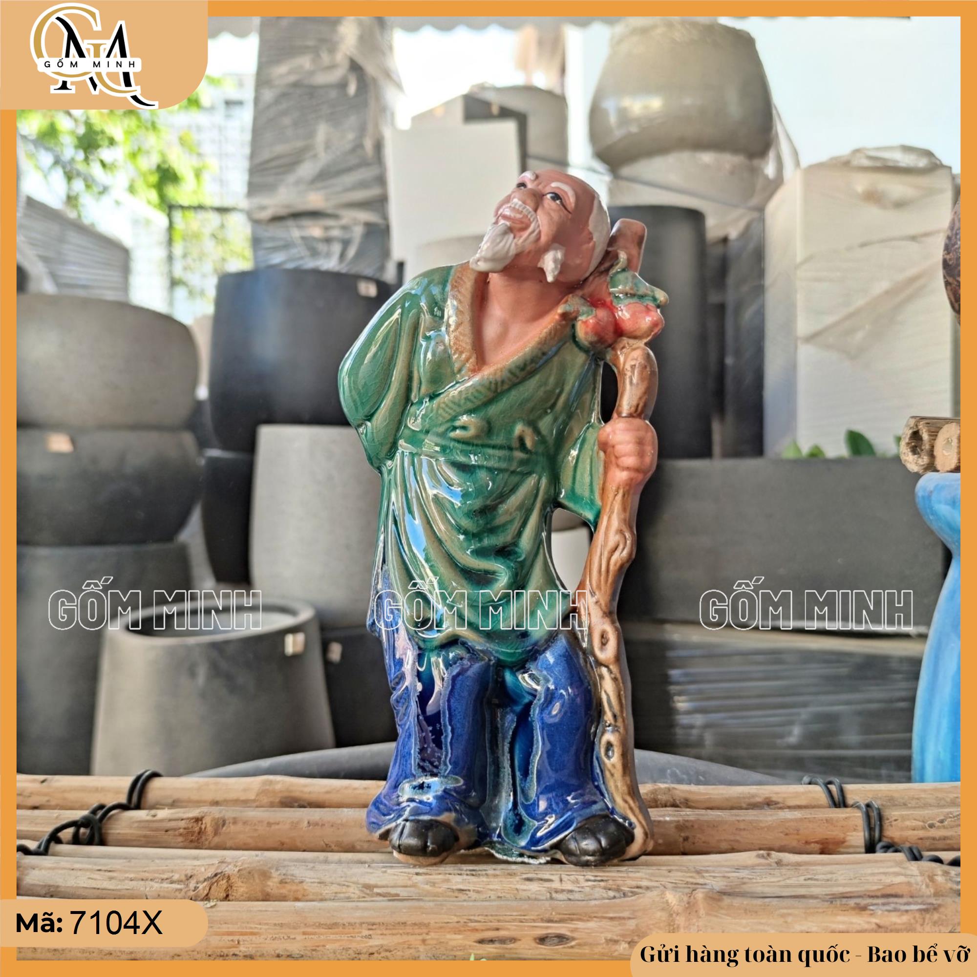Tượng lão mai cầm gậy là hình ảnh đặc trưng của người già trong văn hóa dân gian Việt Nam. Ông lão được chế tác từ gốm Bát Tràng, với bộ râu dài, gương mặt hiền từ, và đôi mắt thể hiện sự từng trải, thông thái. Ông mặc trang phục truyền thống, cầm cây gậy trúc – biểu tượng của sự trường thọ và sức khỏe dồi dào. Tượng thường được thiết kế nhỏ gọn để phù hợp với việc kết hợp trong các tiểu cảnh bonsai, tạo nên vẻ cổ kính, phong trần. Các chi tiết về dáng người, cây gậy và bộ râu đều được chăm chút tỉ mỉ, mang lại vẻ đẹp nghệ thuật và tinh tế.