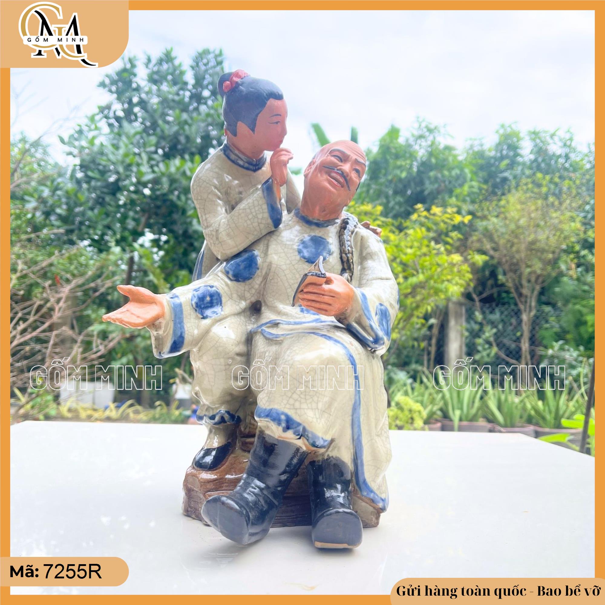 Tượng Lưu Gù cao 30cm là một tác phẩm nghệ thuật tinh xảo, tái hiện chân dung Tể Tướng Lưu Dung (Lưu Gù) thời nhà Thanh. Được chế tác từ gốm sứ Bát Tràng, mỗi chi tiết trên tượng đều thể hiện sự tỉ mỉ và tâm huyết của người nghệ nhân: dáng hình Lưu Gù được khắc họa rõ nét với thân hình mập mạp, lưng gù đặc trưng, cùng nụ cười hiền hậu trên khuôn mặt. Trang phục quan lại được thể hiện sống động, từ đường nét hoa văn đến màu sắc hài hòa.