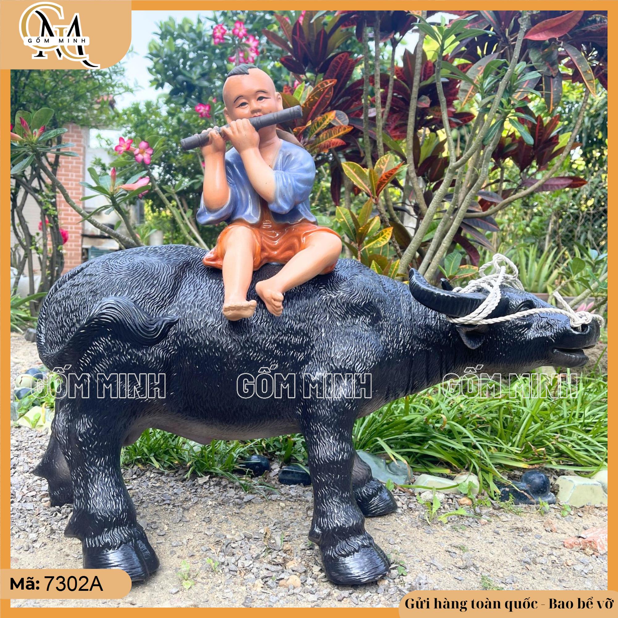 🔸 Thiết kế: Tượng tái hiện hình ảnh quen thuộc của mục đồng chăn trâu – một em bé ngồi thảnh thơi trên lưng trâu với tư thế thổi sáo hoặc đọc sách, gợi nhớ khung cảnh làng quê Việt Nam thanh bình và đầy chất thơ. Trâu được tạo hình vững chãi, từng đường nét gân cơ, sừng, tai đều được thể hiện sống động. Hình dáng mục đồng hồn nhiên, nét mặt hiền hòa, tay cầm sáo hoặc quyển sách, trang phục đơn giản.