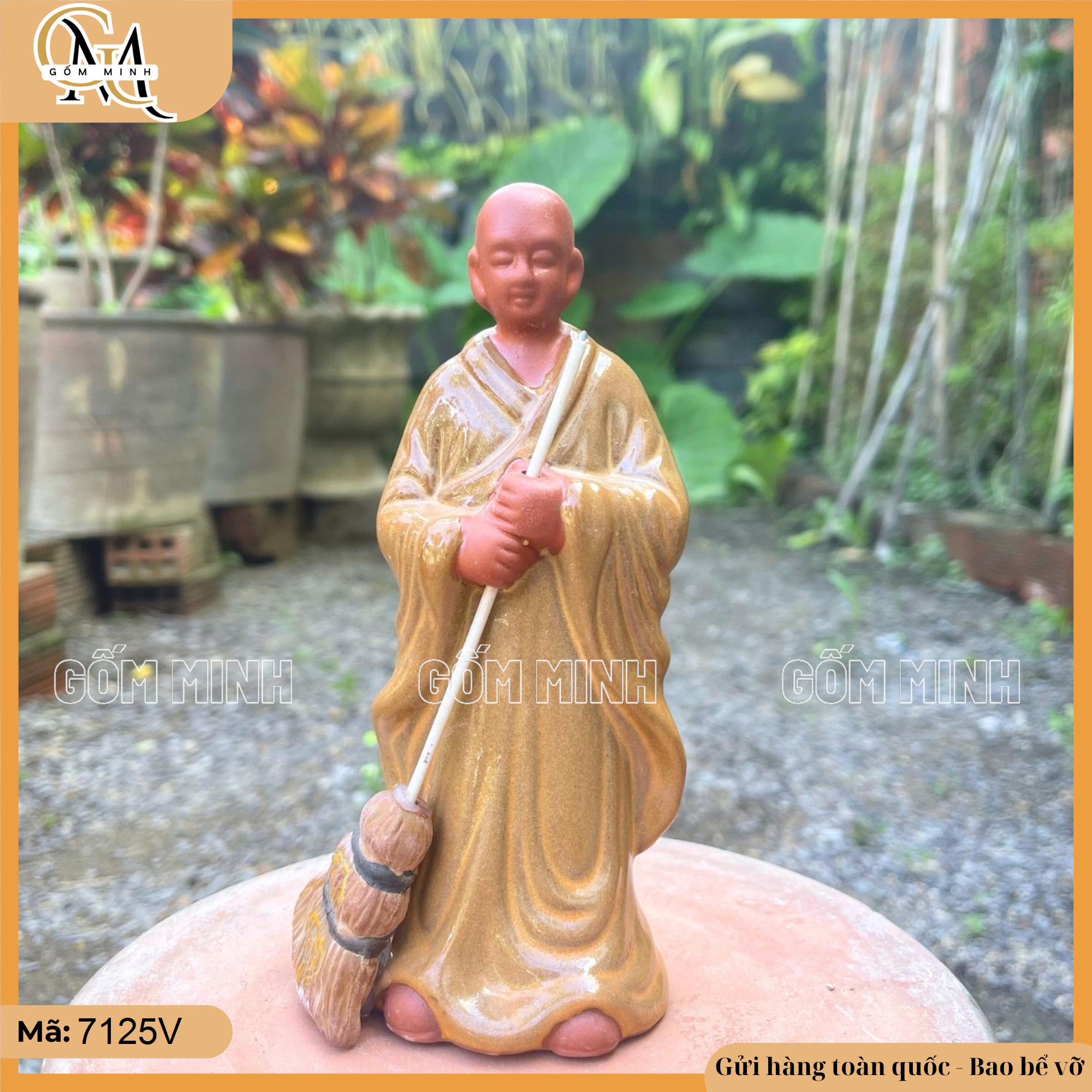 Tượng nhà sư quét chùa được làm từ gốm Bát Tràng, mang đến hình ảnh người tu hành giản dị và thanh tịnh. Tượng mô tả một nhà sư đang quét chùa với cây chổi trong tay, dáng đứng điềm đạm, nhẹ nhàng. Các chi tiết từ y phục đến khuôn mặt của nhà sư đều được chế tác tỉ mỉ, tạo nên một hình ảnh thanh thoát, trầm lắng, gợi lên sự bình yên và tĩnh tại.