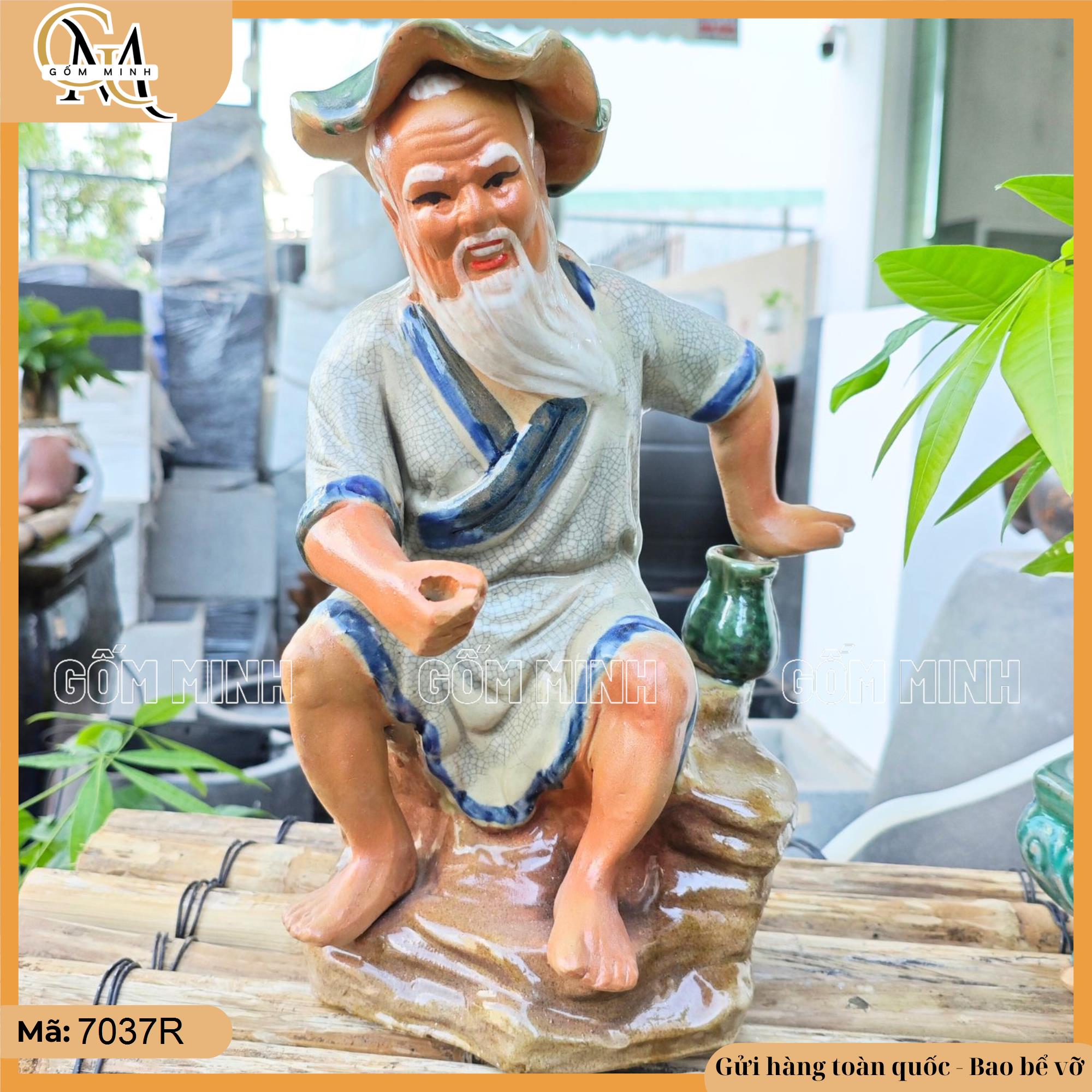 Tượng ông câu cá được chế tác từ gốm men rạn, với chiều cao 30 cm, tạo nên một hình ảnh sống động và chân thực. Ông lão có râu tóc bạc phơ, gương mặt rạng rỡ, biểu hiện sự an lạc và hạnh phúc trong từng khoảnh khắc. Đầu đội mũ, ông ngồi bên cạnh chiếc giỏ cá, đang say sưa câu cá, biểu trưng cho cuộc sống giản dị và gần gũi với thiên nhiên. Các chi tiết từ trang phục đến các đường nét khuôn mặt, đều được chăm chút tỉ mỉ, mang đến vẻ đẹp tự nhiên và truyền cảm.