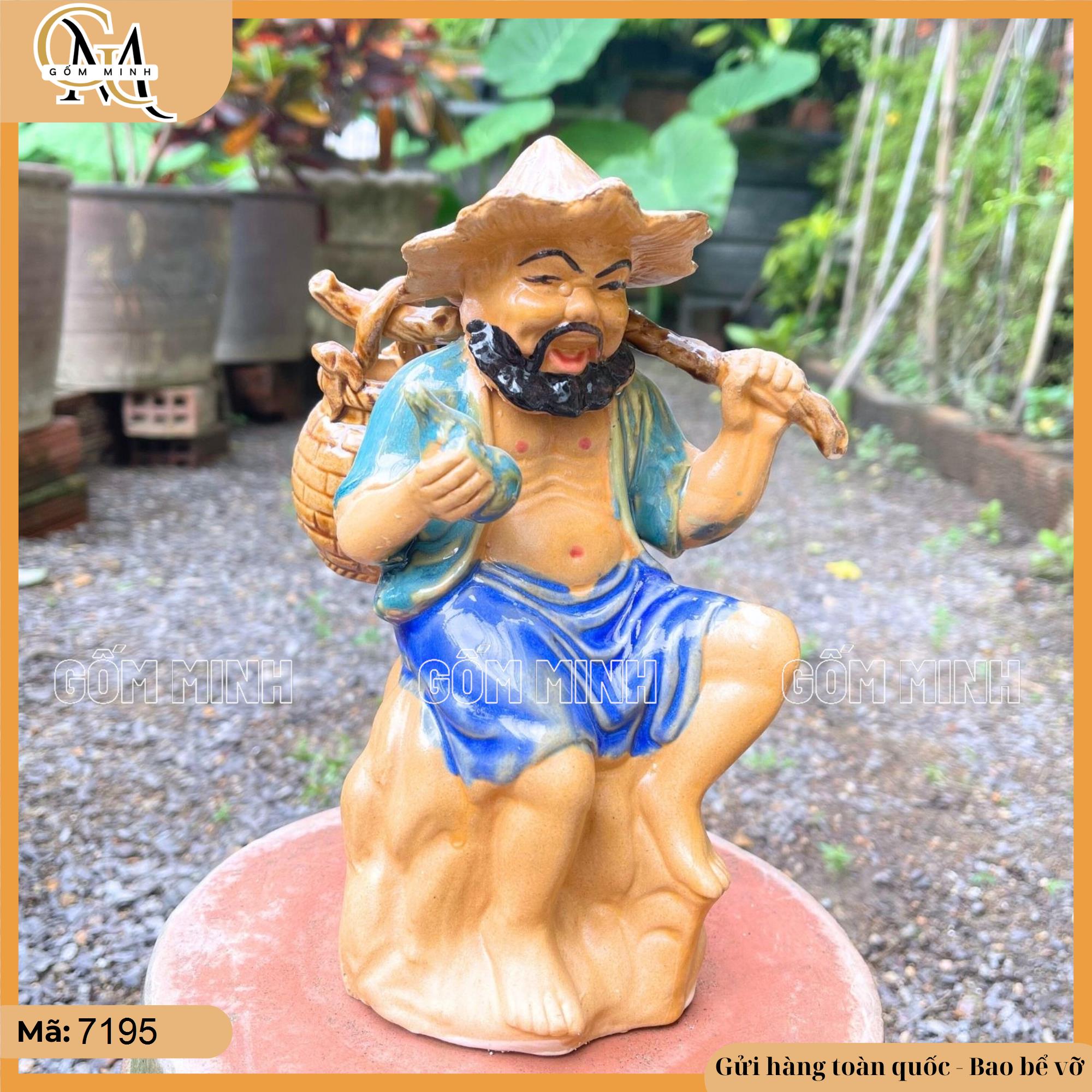 Tượng ông lão quẩy giỏ cá là một tác phẩm nghệ thuật tinh xảo, được chế tác thủ công từ gốm Bát Tràng nổi tiếng. Tượng khắc họa hình ảnh một ông lão phúc hậu, râu tóc bạc phơ, đang quẩy đôi giỏ đầy ắp cá trên vai, mang đậm nét văn hóa truyền thống Việt Nam. Từng chi tiết trên tượng, từ nếp nhăn trên khuôn mặt đến dáng vẻ tảo tần của ông lão, đều được thể hiện một cách tỉ mỉ và sống động. Tượng gốm đẹp này không chỉ là một vật trang trí mà còn là một tác phẩm nghệ thuật đáng trân trọng. Với kích thước vừa phải, tượng dễ dàng được bài trí ở nhiều vị trí khác nhau, tạo điểm nhấn độc đáo cho không gian.