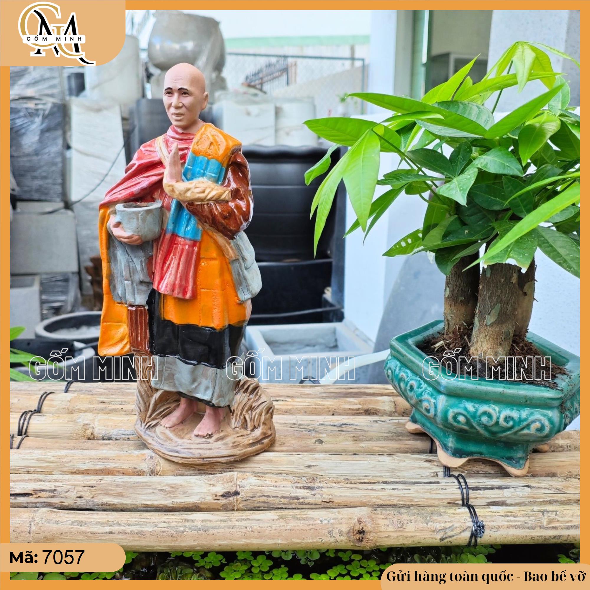 Tượng Sư Thầy Thích Minh Tuệ được chế tác tinh xảo từ gốm Bát Tràng, tái hiện hình ảnh vị thầy tu với dáng vẻ trang nghiêm và thanh tịnh. Tượng có chi tiết sư thầy tay cầm chiếc bát, tay còn lại chắp lại trong tư thế niệm Phật. Thầy mang túi đeo chéo vai, trang phục với nhiều lớp y áo, tạo cảm giác thanh khiết và trang trọng, đúng với hình ảnh của người tu hành.