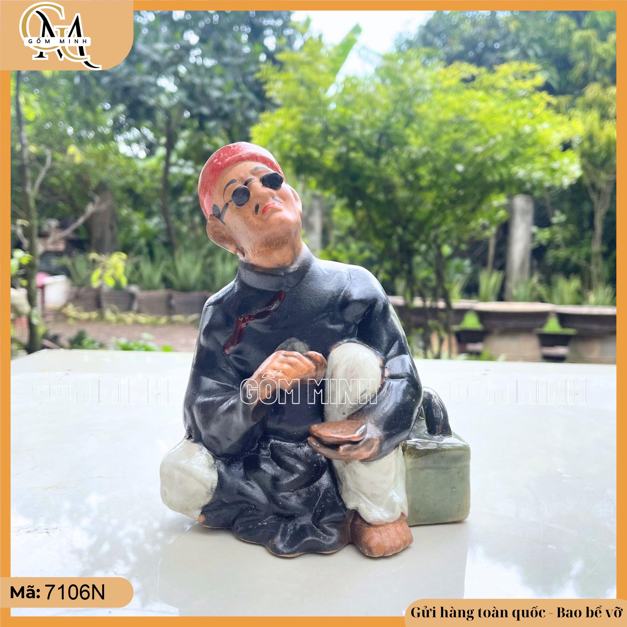Tượng thầy bói được làm từ gốm Bát Tràng, mang hai tông màu chủ đạo là nâu đen và rạn. Hình ảnh thầy bói ngồi trang nghiêm, hai tay cầm hai đồng xu, với khuôn mặt tập trung như đang luận quẻ. Đôi mắt ông đeo kính đen, tạo vẻ bí ẩn, uy nghiêm. Bên hông là túi đồ hình vuông, một chi tiết tinh xảo, gợi nhắc về những vật dụng đặc trưng của nghề bói toán. Thiết kế chú trọng đến từng chi tiết nhỏ, từ trang phục đến tư thế ngồi, mang lại sự sống động và chân thực.