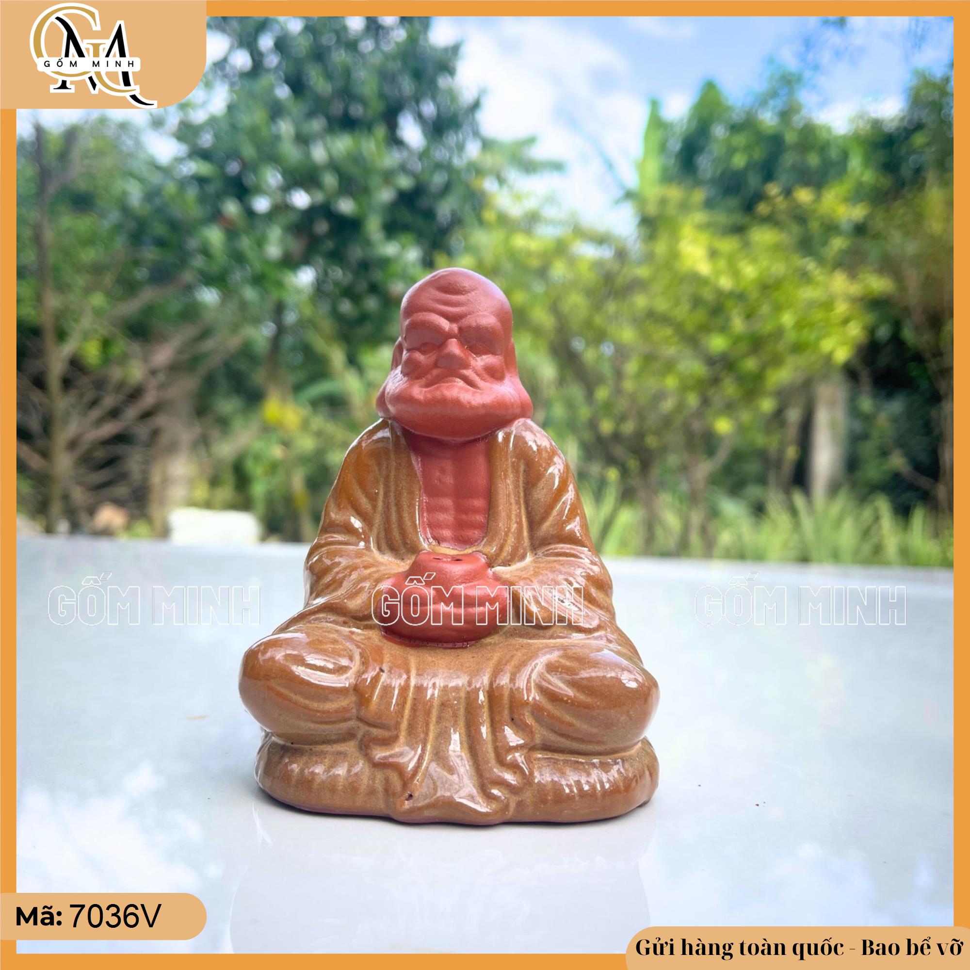 Tượng Tổ Sư Đạt Ma được chế tác từ gốm đỏ với những đường nét tinh xảo, thể hiện phong thái trang nghiêm và thanh tĩnh. Trong tư thế ngồi thiền kiết già, Tổ Sư có gương mặt hiền từ, ánh mắt trầm tư như đang ngẫm nghĩ về đời. Tay phải của Tổ Sư cầm hũ, biểu trưng cho sự trau dồi trí tuệ và truyền bá giáo lý. Những chi tiết trên áo cà sa và đường nét râu tóc được chăm chút tỉ mỉ, tạo nên hình ảnh uy nghi nhưng gần gũi.