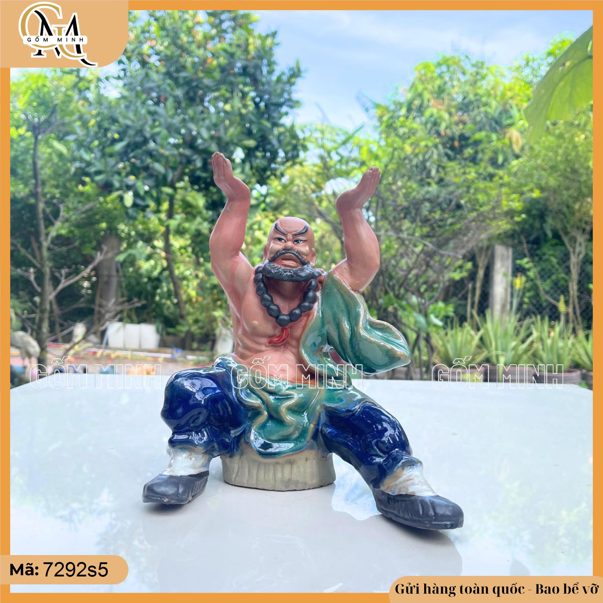 Chậu tượng Lỗ Trí Thâmlà một kiệt tác từ gốm Bát Tràng, tái hiện hình ảnh Lỗ Trí Thâm đầy uy nghi, dũng mãnh. Tượng được thiết kế tinh xảo với dáng đứng vững chãi, hai tay dâng cao chiếc vò lớn. Trên bề mặt vò, dòng chữ "Tài Lộc" được khắc tỉ mỉ, nổi bật, mang đến cảm giác trang trọng và ý nghĩa.
